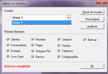 Na tela que abrir, selecione o usuário na qual deseja definir as permissões, automaticamente o sistema irá deixar o usuário com “Acesso Completo”.