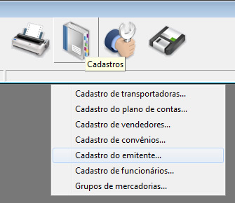 Para fazer o regsitro abra o Aplicativos Comerciais e no menu principal do programa, acesse a opção Cadastros / Cadastro do emitente.