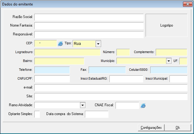 Na tela de cadastro de emitente, preencha os campos com os dados de sua empresa e clique no botão "OK".
