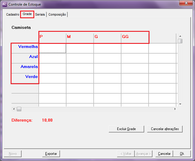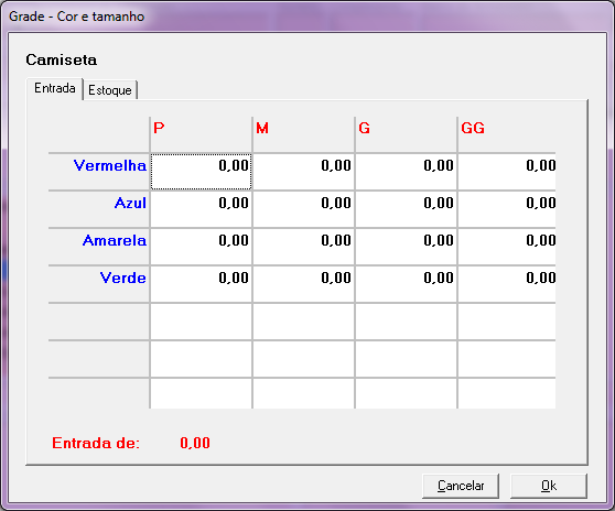 Na Linha e Coluna Cinza, defina as grades a serem utilizadas, no exemplo abaixo, foram cadastradas as cores e tamanhos existentes para este produto.