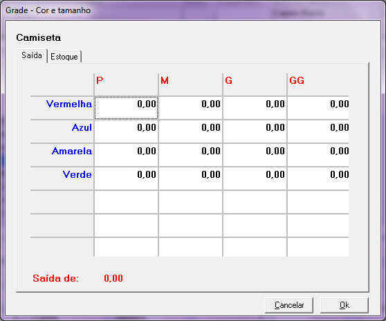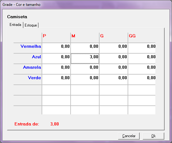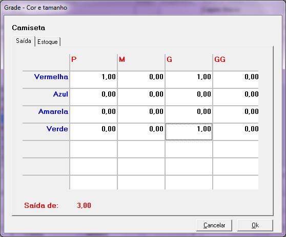 Neste momento, deverá informar qual grade foi vendida, no exemplo abaixo, foram: 1 Camisetas Vermelha – P, 1 Vermelha – G e 1 Verde – G.