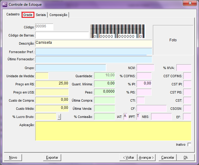 O Aplicativos Comerciais possui o recurso para cadastrar e comercializar produtos controlados através de grade, ou seja, quando o produto possuir duas características como cor e tamanho. Em geral pode ser utilizado em lojas de calçados e confecções.