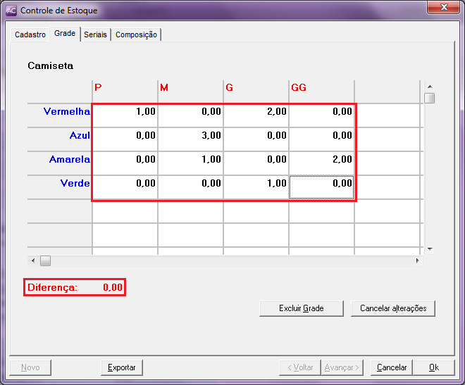 Agora, será definida a quantidade que está disponível para cada “grade”. Ex: Cor Vermelha Tamanho P tem 1, Cor Vermelha Tamanho M tem 1, Cor Amarela Tamanho GG tem 2 e assim por diante. Observe que possui um campo Diferença, este campo indica a quantidade de produtos que tem no estoque, na qual deverá ser distribuído na grade. Este campo sempre deverá estar zerado, pois significa que todos os produtos foram “configurados” com a grade correta.