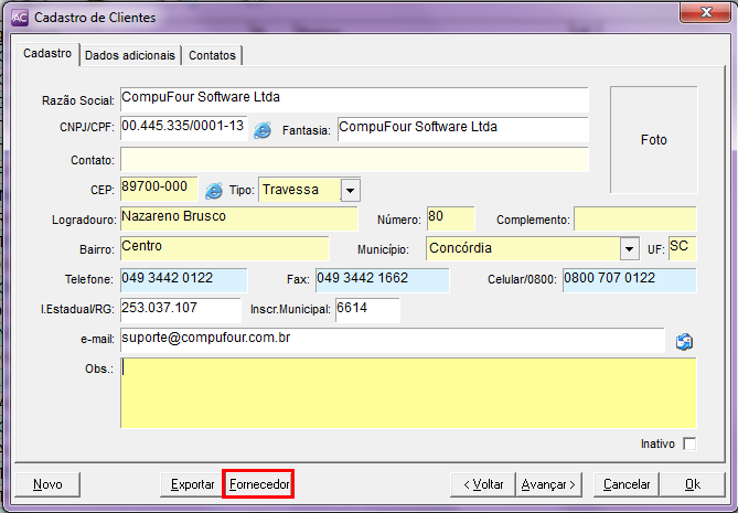 Primeiramente deve ser cadastrado o cliente da nota de venda como um Fornecedor, para isso acesse o cadastro do cliente e clique na opção Fornecedor;