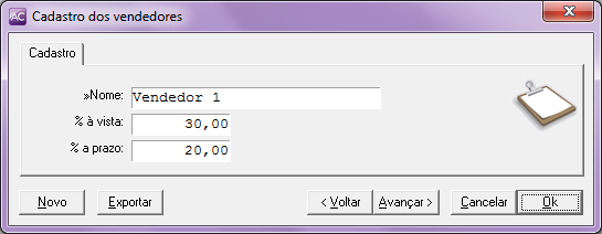 Primeiramente devemos cadastrar o Vendedor e a porcentagem de comissão que o mesmo terá para vendas à vista e vendas a prazo. Para isso, acesse o módulo Cadastros / Cadastro de Vendedores / Novo;