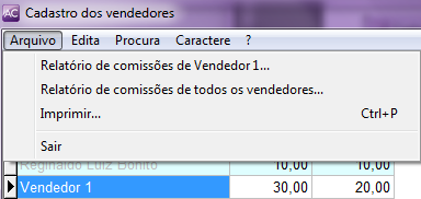 É possível gerar um relatório de comissões do vendedor individual ou ainda a comissão de Todos os vendedores. Para gerar os relatórios, acesse o módulo Cadastro / Cadastro de vendedores, selecione o vendedor, clique no Menu arquivo e selecione a opção desejada.