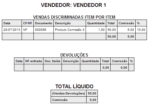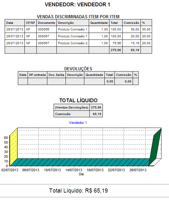 - Discriminado item por item: Serão apresentados todos os produtos vendidos, bem como a comissão calculada para cada um. Nesta opção, também será gerado um gráfico das comissões do vendedor no período.