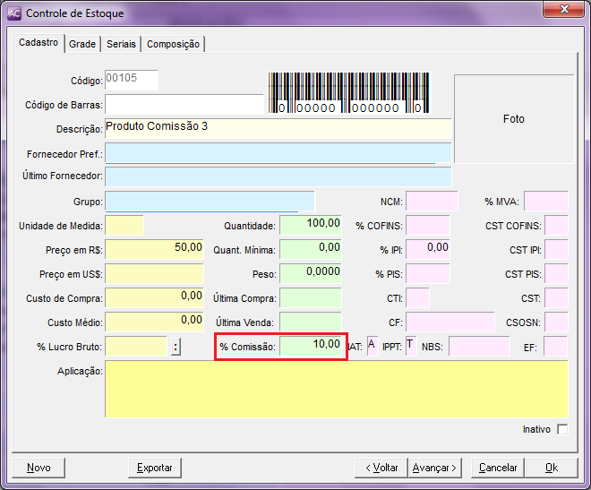 É possível também definir uma comissão por produto. Para isso, acesse o módulo Estoque e preencha o campo %Comissão: