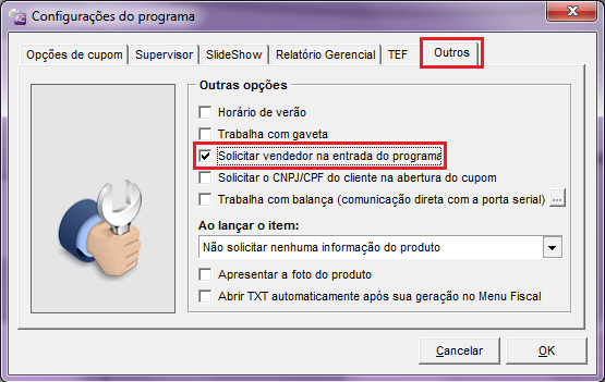Outra forma é informar o vendedor na abertura do programa. Para isso, pressione a tecla F10 – Configurações – Configurações do programa / Ficha Outros / Marque a opção “Solicitar Vendedor na entrada do programa”.