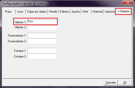 Na guia +Campos, na opção “Clientes 1” informe o nome do campo a ser adicionado, uma sugestão será preencher com o nome País e clique em Ok.