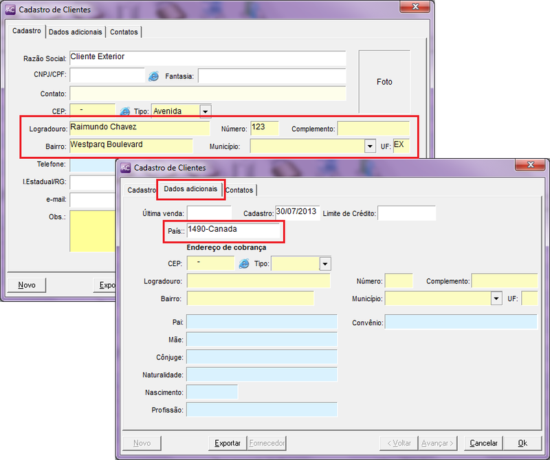 - Código e País (essa informação deve ser digitada no campo ‘Adicional 1’ do cadastro do cliente e deve conter o seguinte padrão: 1111-País, onde 1111 é o código do país com 4 dígitos, – (hífen), Nome do país de destino, sem utilizar espaços). Para consultar o código do país clique aqui.
