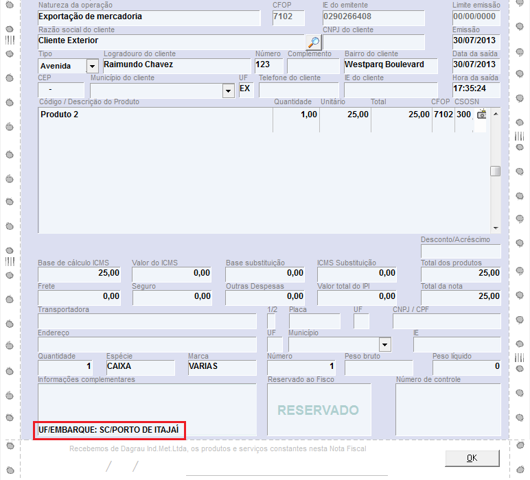 Cadastrado o cliente e os produtos, acesse o módulo de nota de venda e clique em Novo e faça o lançamento normal da nota. No caso da Nota Fiscal de Exportação, deverá ser preenchida na 5ª linha das Informações Complementares, a UF de embarque e o Local de embarque, no padrão informado no exemplo abaixo: