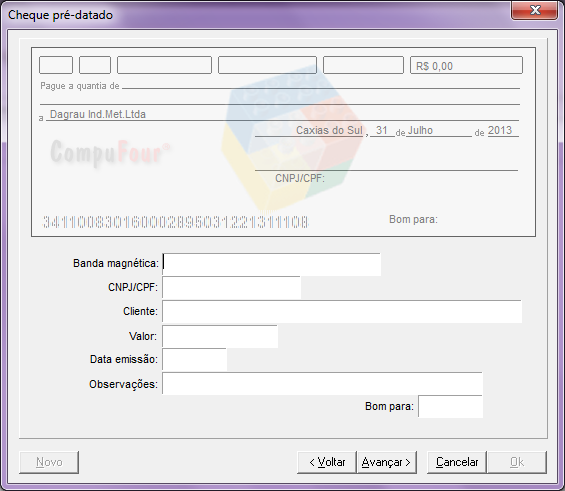 Fazer o cadastro do cheque manualmente, para isso, acesse o módulo Cheques Pré-Datados e clique no botão Novo. Será apresentada a tela onde fará o preenchimento das informações do cheque. Para fazer a identificação do cheque deverá digitar a banda magnética ou passar o cheque no leitor de cheques.