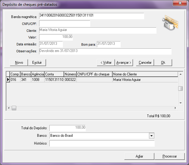 Para incluir mais de um cheque no depósito, lance o primeiro cheque, confirme os dados, clique no botão “Novo” na parte superior da tela, depois escolha o banco e finalize o depósito de todos os cheques.