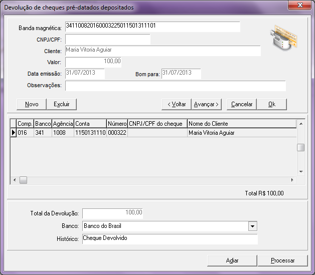 OBS: Efetuado uma devolução é registrada uma entrada no caixa com o valor do cheque e no banco é abatido o valor do cheque devolvido.