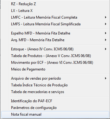Para conseguir acessar o módulo de Nota Fiscal Manual, abra o Emissor de Cupom Fiscal e pressione a tecla F7, irá aparecer o Menu Fiscal, selecione então a opção Nota Fiscal Manual, como na imagem abaixo.