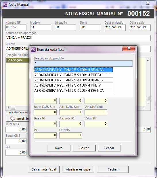 Após selecionar o cliente, clique no botão “Incluir item” e lhe será exibida a tela para o lançamento dos produtos, como imagem a seguir.