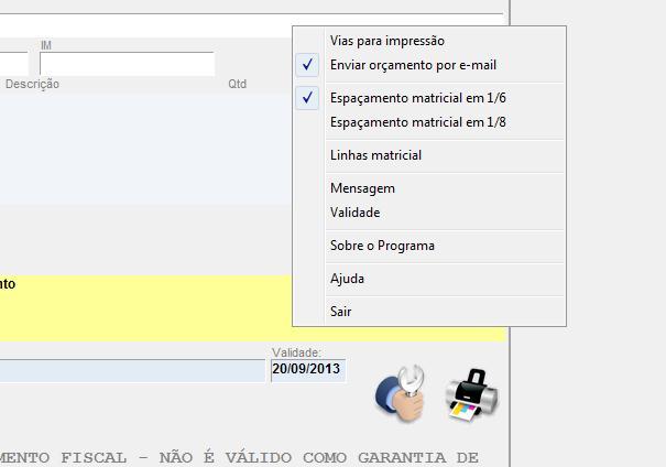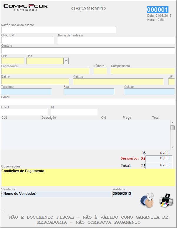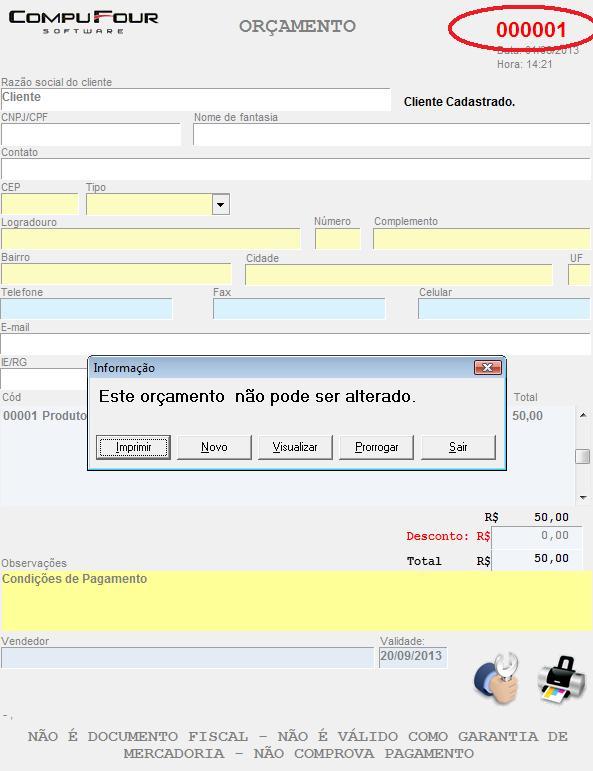 Dentre as opções do orçamento serão informados o cliente, os produtos orçados e suas observações, bem como poderá ser impresso ou enviado por email. A impressão será feita na impressora padrão do Windows. No caso de ter Impressora Fiscal o Orçamento não irá abrir no mesmo computador, aparecerá a mensagem “Opção Não permitida” ao clicar no ícone.