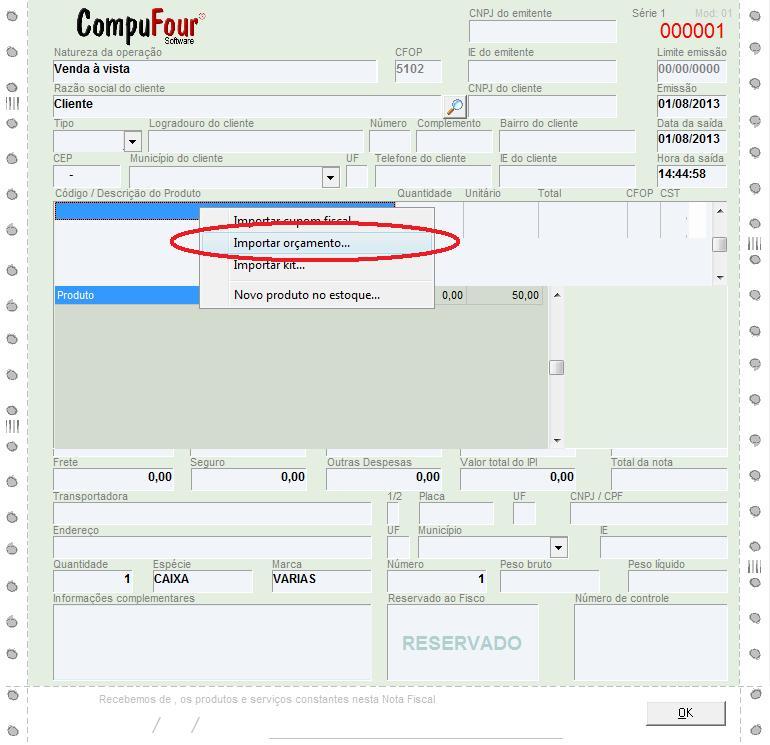Para importar o orçamento para uma Nota Fiscal, acesse o módulo de vendas em seu Aplicativos Comerciais, crie uma nova venda, Selecione a Natureza de operação e o Cliente e no momento em que ir para o campo onde preencher o produto, pressione a tecla “Insert” ou clique com o botão direito do mouse e vá na opção importar orçamento, aparecerá então a tela para informar o número do orçamento.