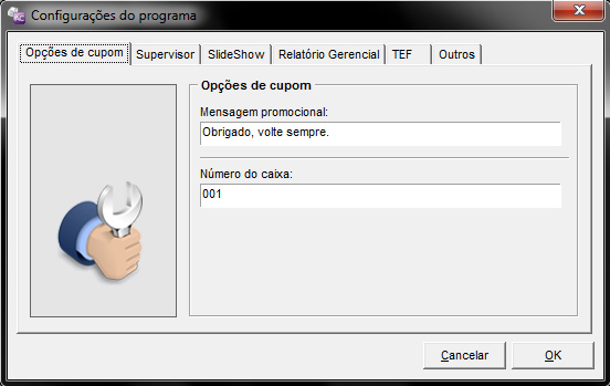 Na tela apresentada e na guia Opções de Cupom podemos definir uma mensagem promocional e também o número do caixa, conforme a imagem a seguir.