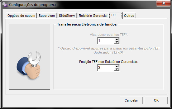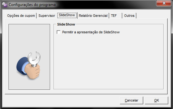 A guia Slide Show possibilita apresentar imagens pré-definidas no módulo de ECF, como se fosse uma apresentação de slides. Caso desejar, também poderá deixar a opção desmarcada e neste caso, pode-se definir a logo da empresa na tela do ECF.