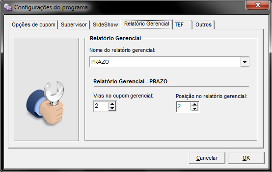 Na guia Relatório Gerencial é possível definir a quantidade de vias de impressão para um relatório gerencial, assim como a posição que a mesma tem definida na impressora, como podemos identificar na imagem abaixo, no caso para venda à prazo.