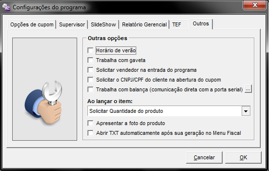 Na guia Outros, há opções específicas de configuração, como por exemplo, definir para trabalhar em Horário de verão, trabalhar com gaveta ou balança, solicitar o vendedor na entrada do programa, solicitar o CNPJ/CPF na abertura do cupom, apresentar a foto do produto ou ainda, poderá selecionar na opção “Ao lançar o item” para informar a quantidade do produto no momento de efetuar a venda sem que seja necessário lançar todos os itens iguais individualmente no cupom.