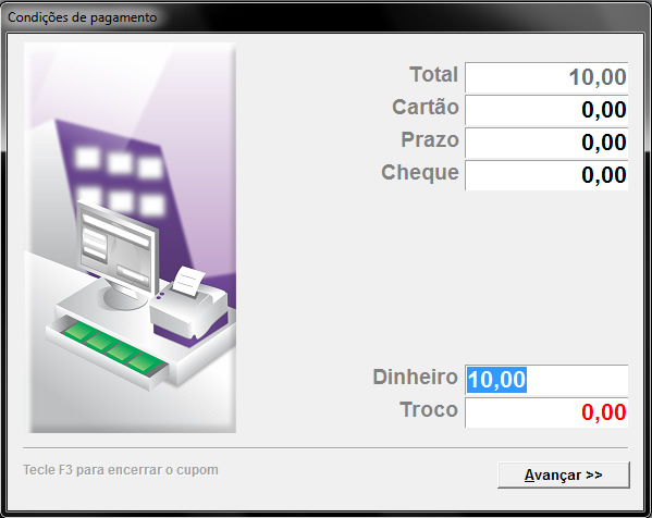 Ao finalizar a venda pressionando uma vez a tecla F3 será apresentada a tela abaixo. Para vendas à vista, em dinheiro preencha o valor total no campo dinheiro como apresenta a imagem.