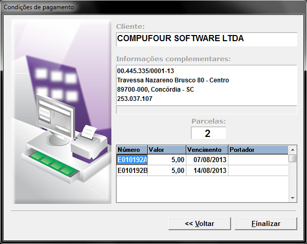 Caso desejar efetuar uma venda à Prazo, preencha o valor total no campo Prazo e clique no botão Avançar. Na próxima tela apresentada, defina a quantidade de parcelas, bem como datas de vencimento e o cliente, conforme a imagem a seguir.
