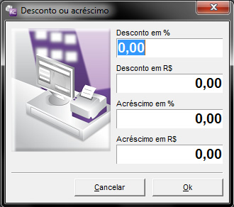 Para inserir um desconto/acréscimo no total de um cupom fiscal, na tela de formas de pagamento pressione a tecla F8, será apresentada a tela abaixo solicitando o desconto/acréscimo em R$ ou em %. Este valor será descontado/acrescentado no total do cupom fiscal.