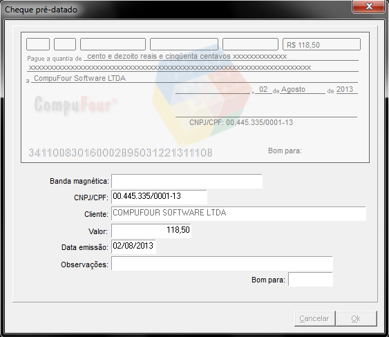 Para finalizar uma venda com o meio de pagamento Cheque, coloque o valor total da venda no campo Cheque, na tela das formas de pagamento e depois clique no botão Avançar. Será apresentada a tela a seguir, solicitando o preenchimento das informações relacionadas ao cheque, após preencher as mesmas, clique no botão Ok para finalizar a venda.