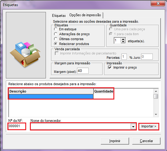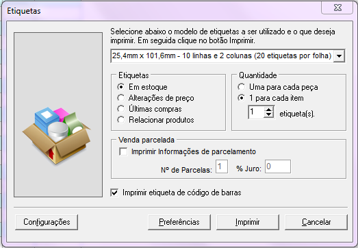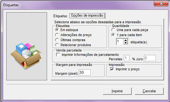 Imprimir informações de parcelamento: irá imprimir etiquetas com as informações da venda a prazo, número de parcelas e % de juro;