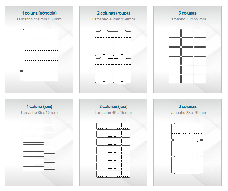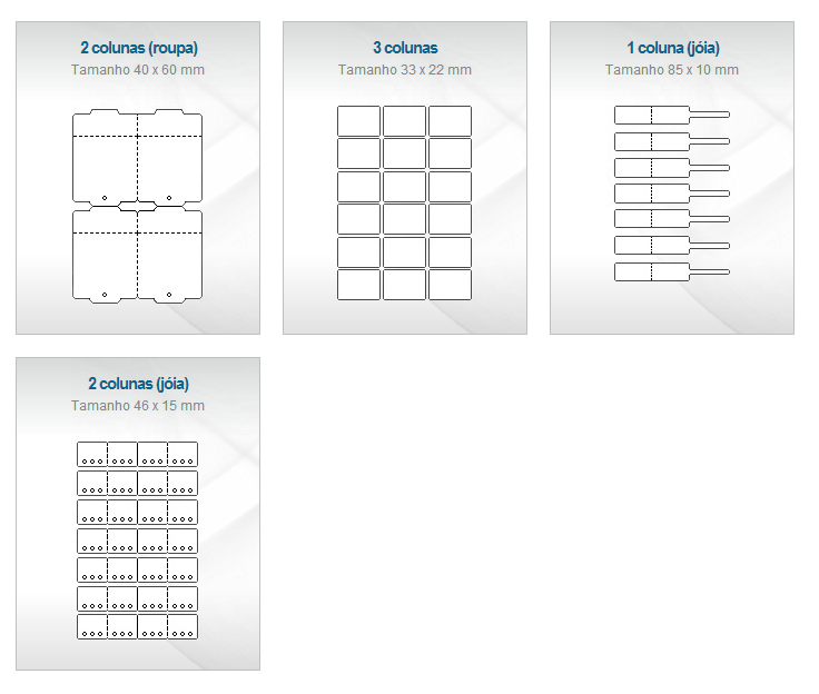 Para as etiquetas em bobina é possível fazer a impressão apenas dos modelos já configurados, não sendo possível uma nova configuração pelo usuário. Caso o usuário necessite de outro modelo e a CompuFour Software entender que o modelo será útil para outros usuários do software, a inclusão destes novos modelo poderá ser feita em uma nova versão do sistema.