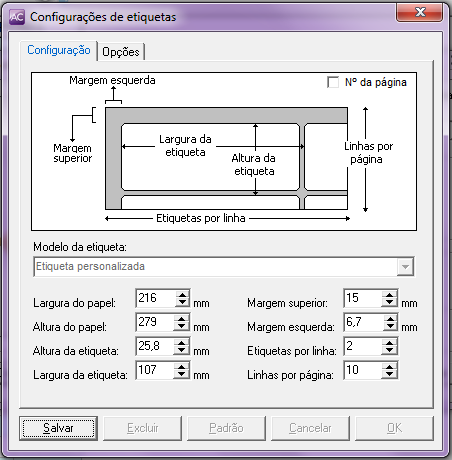 No desenho da etiqueta mostrado na parte superior desta tela existe uma opção chamada Nº da página que está localizada mais especificamente no canto superior direito deste desenho. Caso essa opção for marcado, o programa irá imprimir o número da página em cada folha impressa de etiquetas.