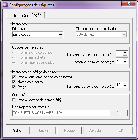 - Imprimir campo comentário: O programa irá imprimir na parte inferior de sua etiqueta uma mensagem que pode ser configurada no sistema. Além disso, caso sua impressora seja uma jato de tinta ou laser, pode-se escolher a cor dessa mensagem, destacando-a na hora da impressão.