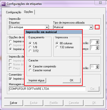Caso indicar uma impressora matricial e clicar no botão Configurações / Nova / poderá configurar uma nova etiqueta para a impressora matricial. Poderá imprimir régia, definir o tipo de caracter, espaçamento e impressora conforme apresentado abaixo.