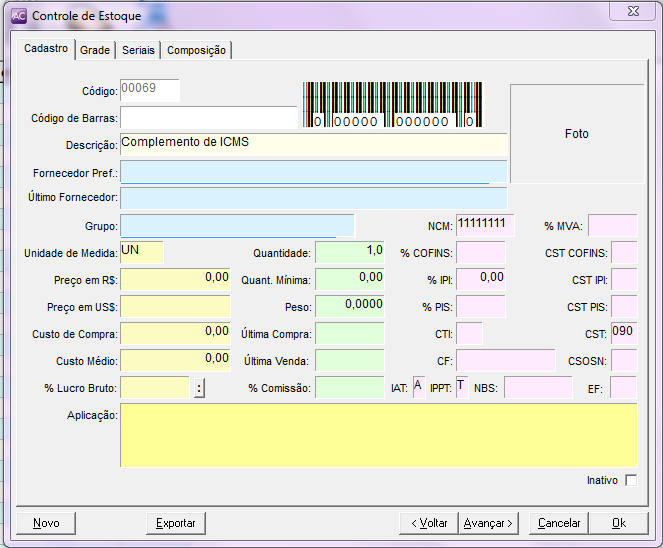 Para as duas situações, acesse o sistema Aplicativos Comerciais / Estoque e cadastre o item com as seguintes informações: