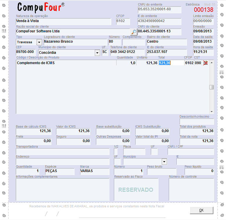 Deve ser feito uma nota fiscal no módulo de Vendas com os seguintes dados: