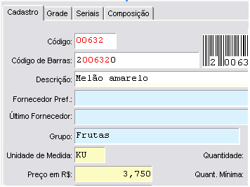 Após cadastrado o produto, é necessário cadastrar o Código de Barras para produtos pesados. O preenchimento do código de barras é um padrão para todas as balanças (7 dígitos) e segue o seguinte formato: