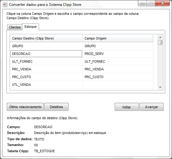 O botão Detalhes exibirá as informações sobre cada campo do Clipp Store.