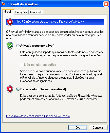 Para desabilitar o Firewall faça os seguintes procedimentos:
