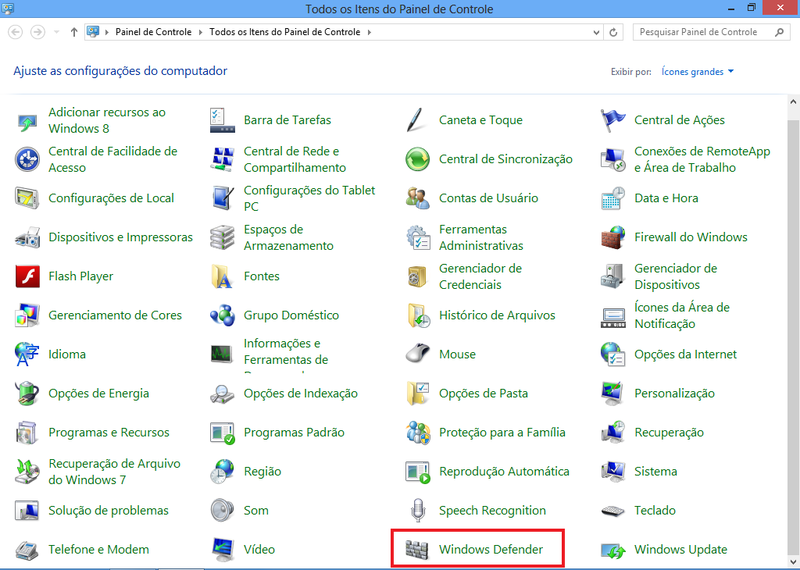 1. Para desabilitado o Windows Defender, ainda dentro do painel de controle localize e acesse a opção de Windows Defender;
