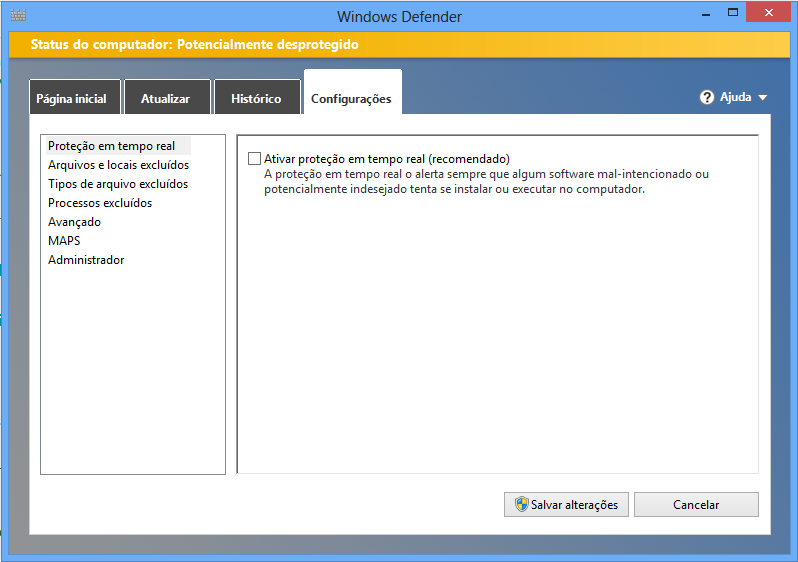 3. Na próxima tela simplesmente desabilite a opção Ativar proteção em tempo real (recomendado);