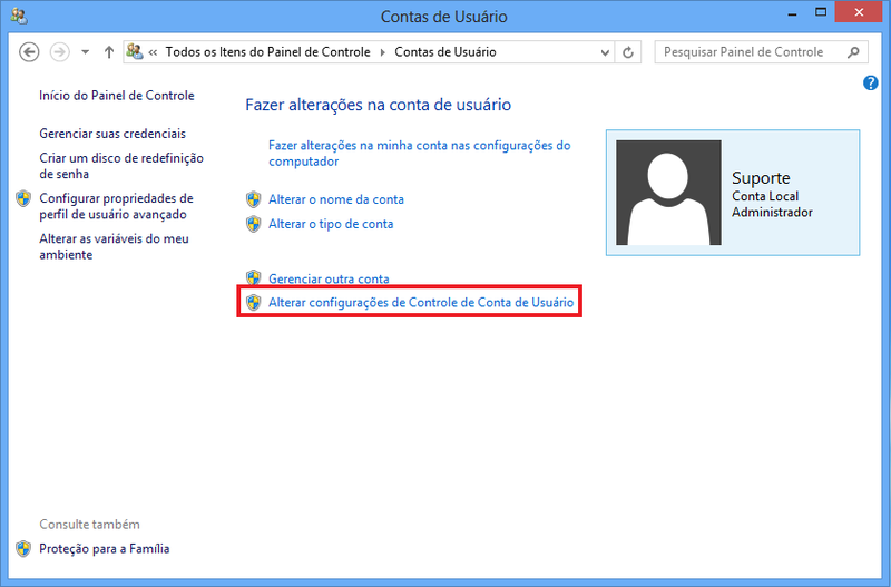 5. Será aberta uma tela onde deve clicar sobre "Alterar configurações de Controle de Conta de Usuário", como mostra imagem abaixo: