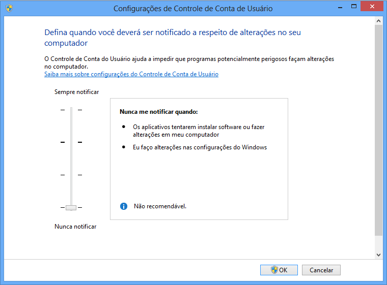 6. Será aberta uma tela com uma barra na posição vertical com um marcador sobre a mesma, o marcador deve estar posicionado na última opção "Nunca notificar"(conforme imagem abaixo), após alterar essa opção clique em OK e reinicie o computador;