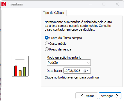 Clique no botão Avançar e serão listadas as opções de valores que podem ser utilizados para a impressão do inventário. Consulte nesse momento seu contador, defina o valor solicitado e avance (geralmente é utilizado o custo médio). Caso desejar gerar o inventário referente a outro período, a opção Estoque Atual poderá ser desmarcada e em seguida definida uma data para a geração do inventário.