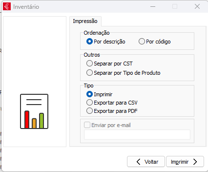 Na próxima tela poderá escolher o tipo de ordenação, se deseja separar por CST, Imprimir, exportar para CSV (Excel) ou exportar para PDF. Marcando as opções CSV ou PDF, será possível enviar o Inventário para um enderço de email.