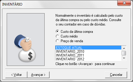 Clique em Avançar e serão listadas as opções de valor a ser selecionada, consulte o contador para definir essa opção (geralmente é utilizada a opção de Custo médio);