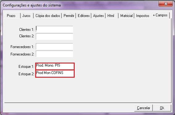 Para o campo Estoque 1 digite: Prod. Mono. PIS e para o campo Estoque 2 digite: Prod Mon COFINS (conforme indicado na imagem abaixo) após clique em Ok.
