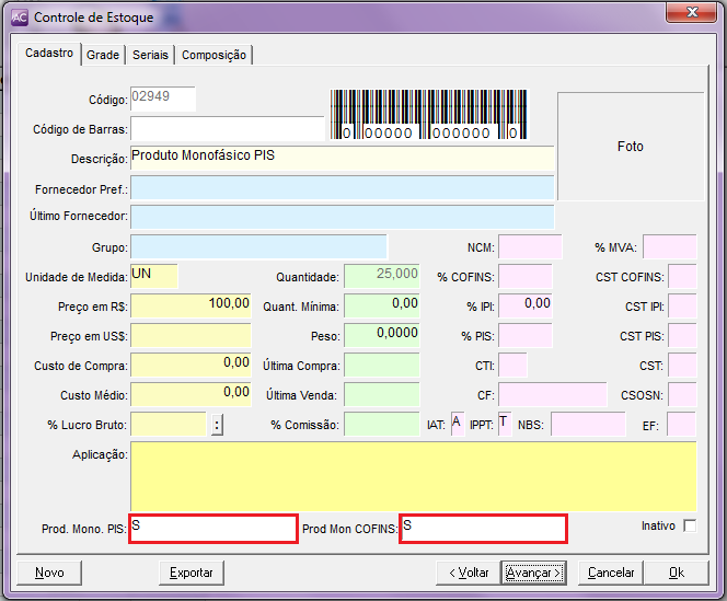 Agora acesse o Módulo estoque, em cada produto informe S se o mesmo for um produto Monofásico de PIS e COFINS ou N quando o produto não for Produto Monofásico de PIS e COFINS (conforme exemplo abaixo), após clique em OK.